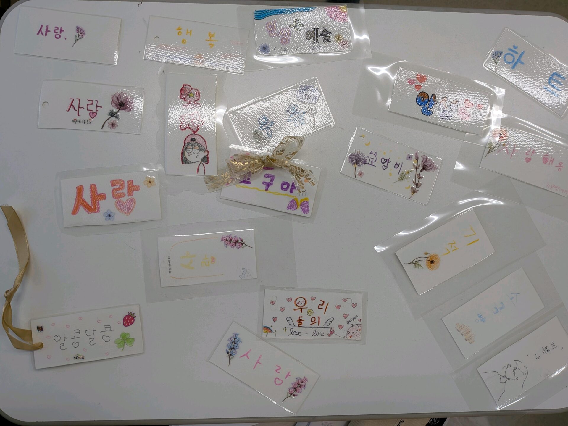 친구에게 전하고 싶은 한마디를 한국어로 책갈피에 적고, 각자 개성 있게 디자인했습니다.