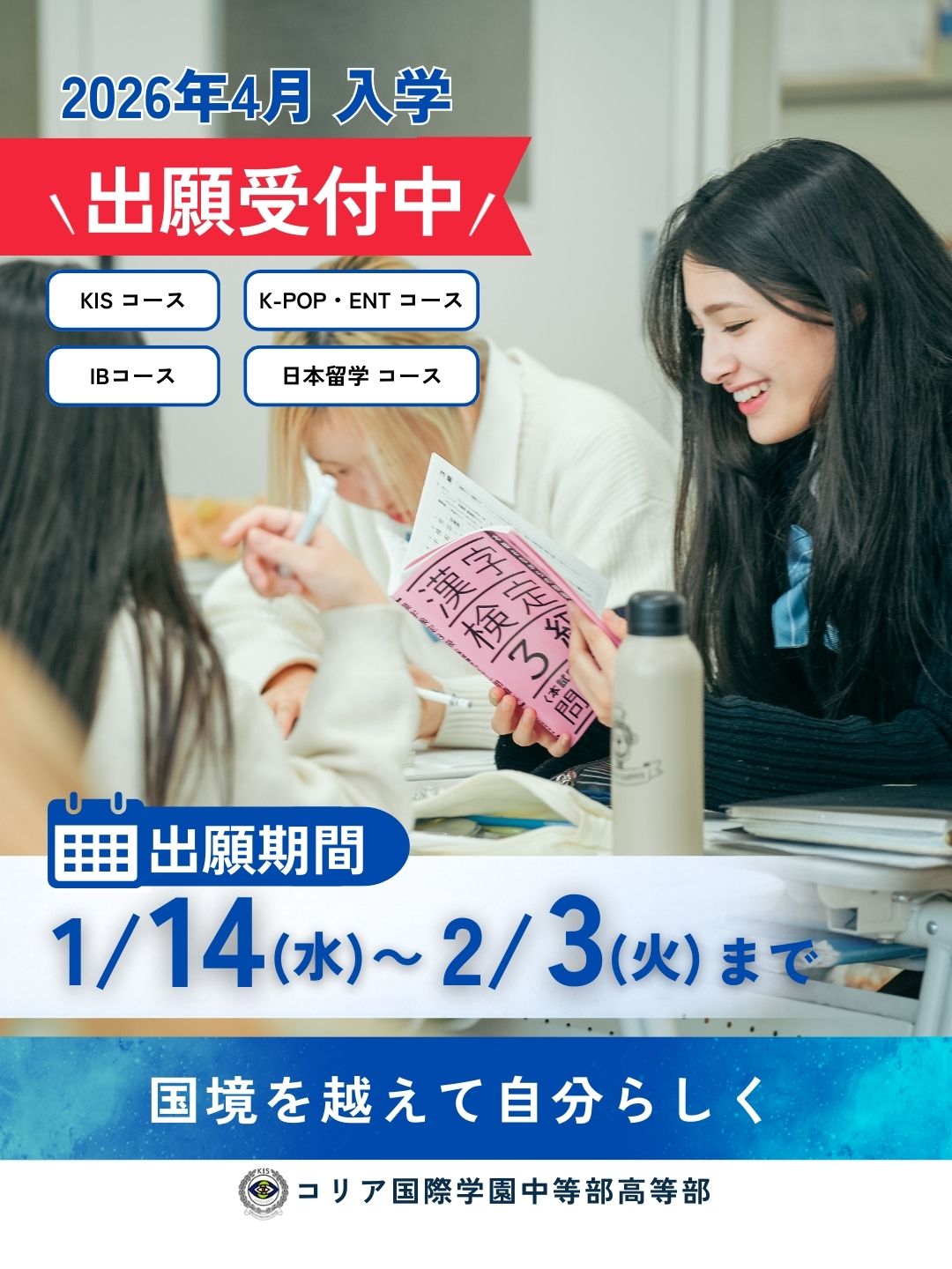KISコース、K-POP・エンターテインメントコース、IBコース、日本留学コースなど、特色ある学びを通して、「国境を越えて自分らしく」学ぶ環境を提供しています。