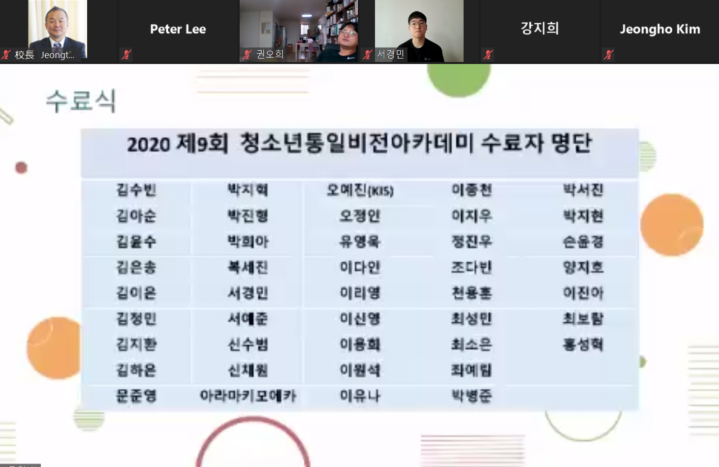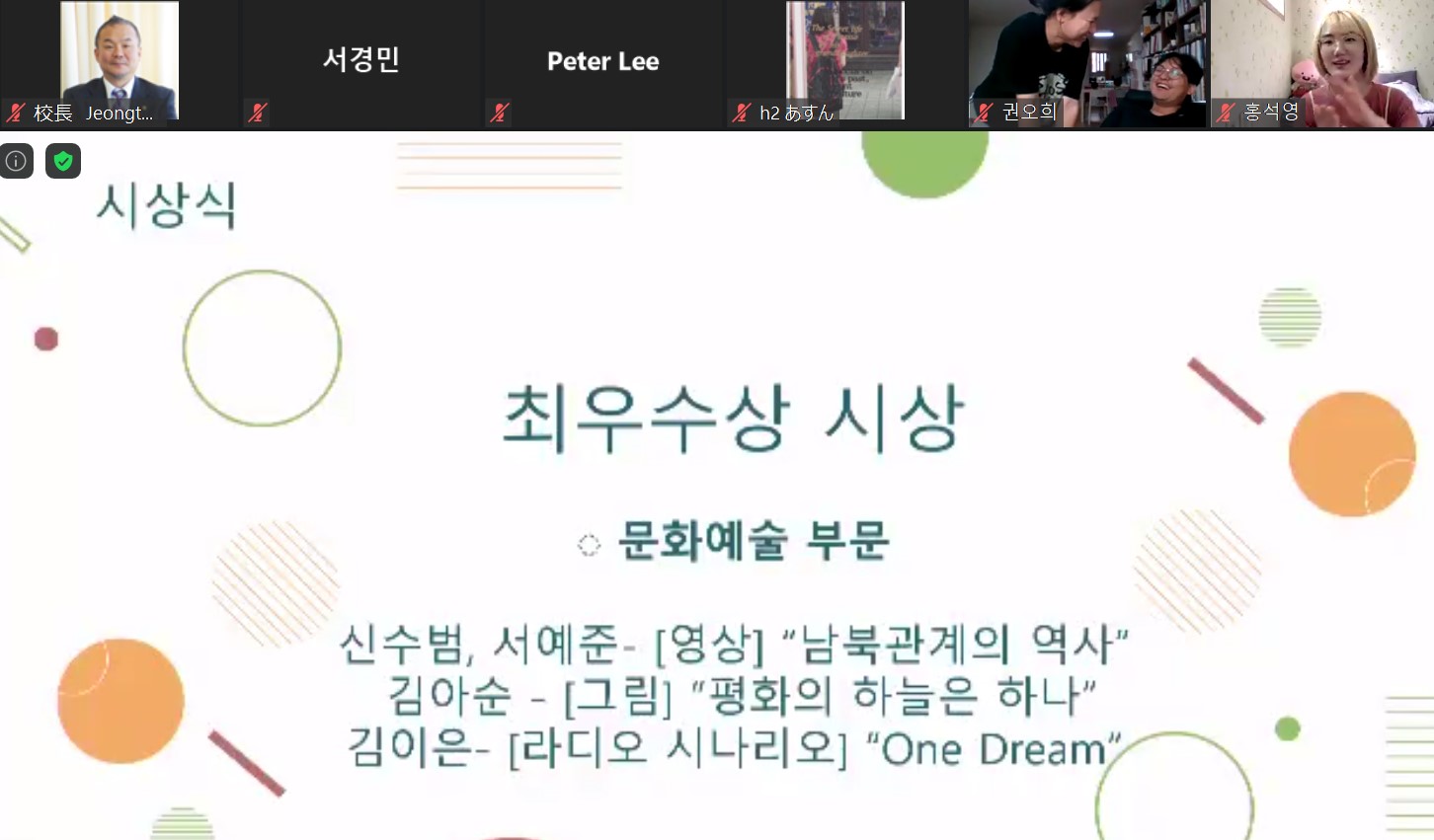 韓国のNGO平和韓国が主催する「平和韓国統一ビジョンアカデミー&セミナー」が6月から9月まで実施され、コリア国際学園からも、たくさんの生徒たちが参加してくれました。例年はソウル大学などで開催されますが、今年はオンラインでの開催となり、韓国だけでなく日本や中国からも参加しました。アカデミーは政治、経済、社会、市民活動などの専門家から5回の講義を聞き、各回のレポートと最終レポートを提出することで終了することが出来ます。コリア国際学園からは吳叡眞さん(高1)、李莉瑛さん(高1)、金亜純さん(高2)、金潤秀さん(高2)、荒巻萌加さん(高2)、李侑奈さん(高3)が終了しました。修了式では、日本人や在日コリアンが、コリア語だけで行われた統一アカデミーに参加し、修了したことに対して高い評価をいただきました。また、統一セミナーでは、金亜純さん(高2)、金潤秀さん(高2)、荒巻萌加さん(高2)さんが、平和と統一をテーマとした独創的な作品を出品しました。金亜純さんの作品「平和の空はひとつ」が最優秀賞を受賞し、金潤秀さん、荒巻萌加さんが優秀賞を受賞しました。