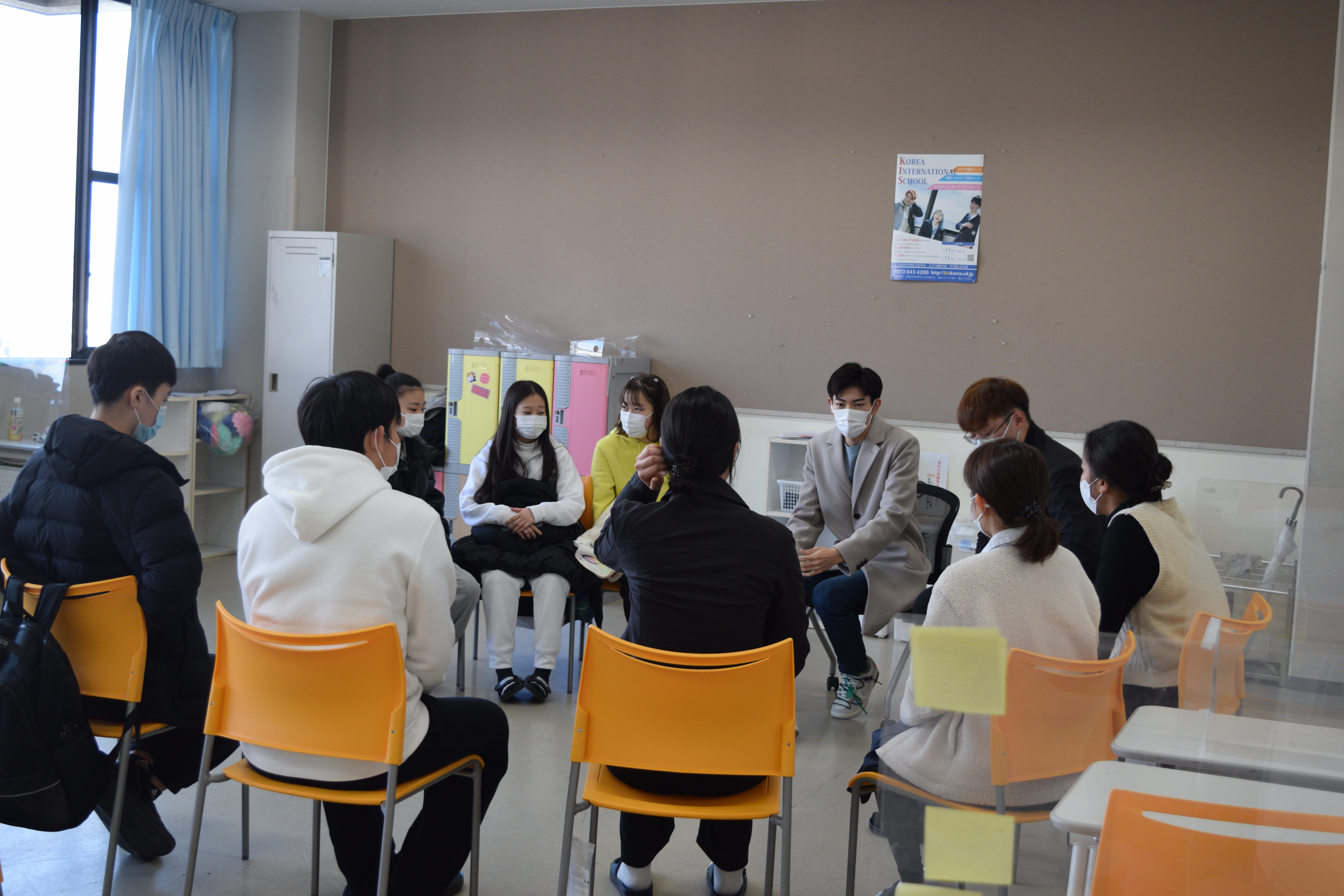 コロナ禍により、途絶えがちになってしまった卒業生と在校生との交流を繋ぎ直すべく企画した交流会です。対面6,オンライン1の7グループに分かれ、前半のディスカッション部では、当時のKIS、卒業生の現在、KISで学んだことをどういかすか、目指すKIS像などを活発に話し合いました。
