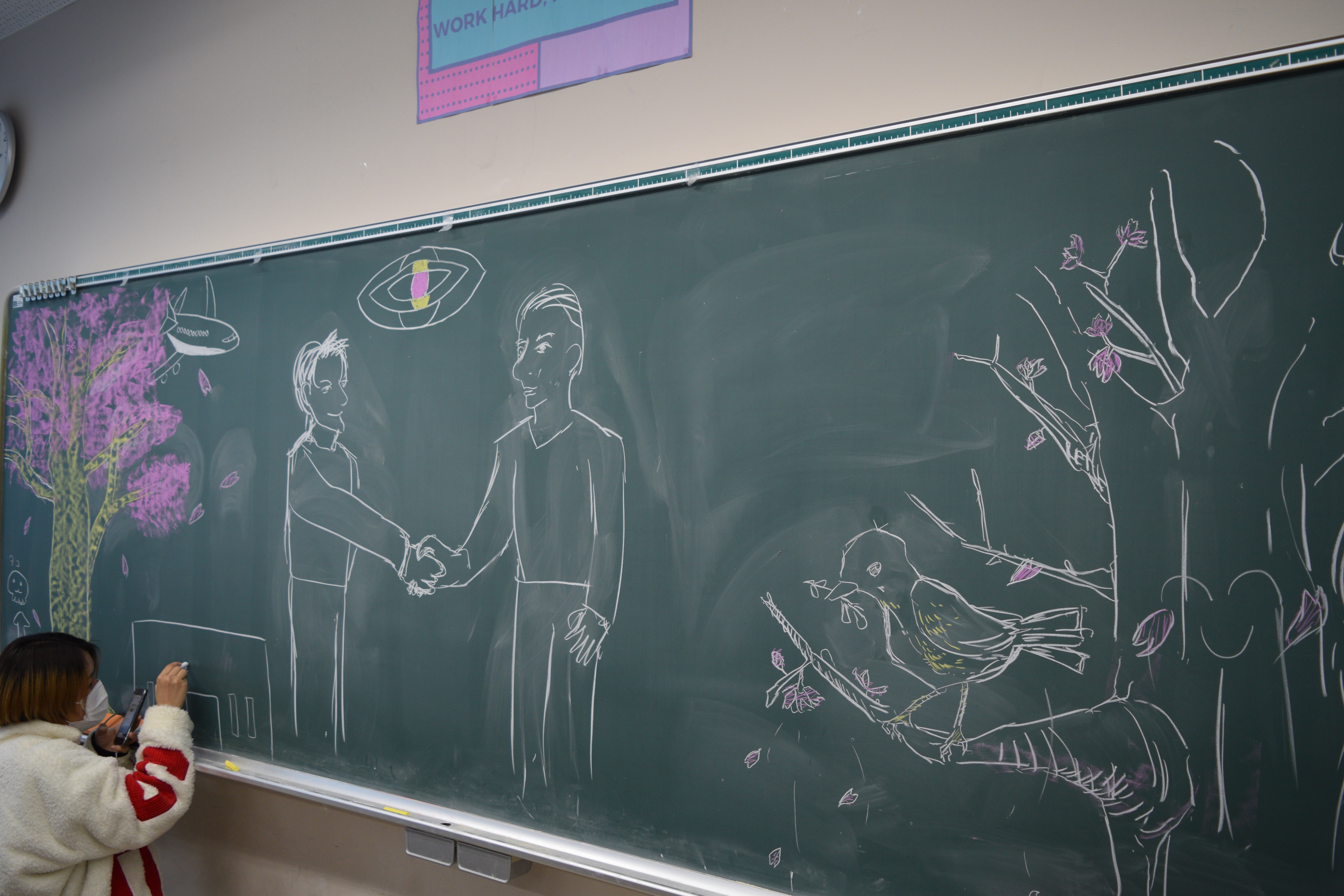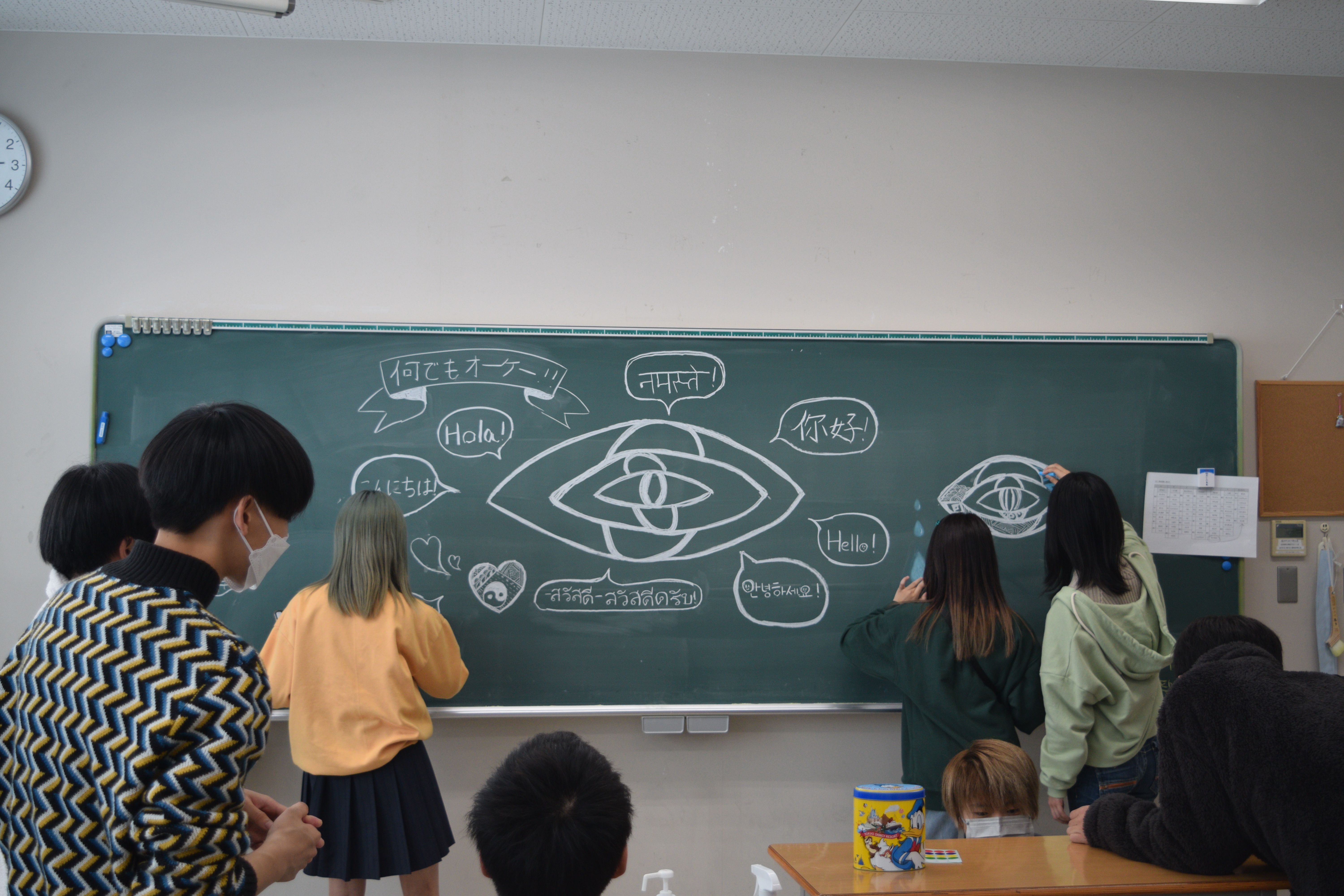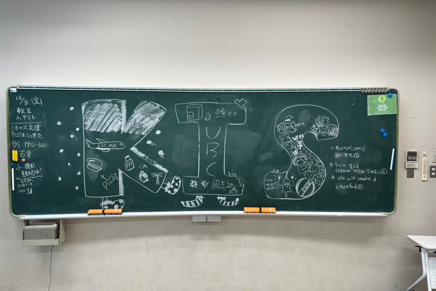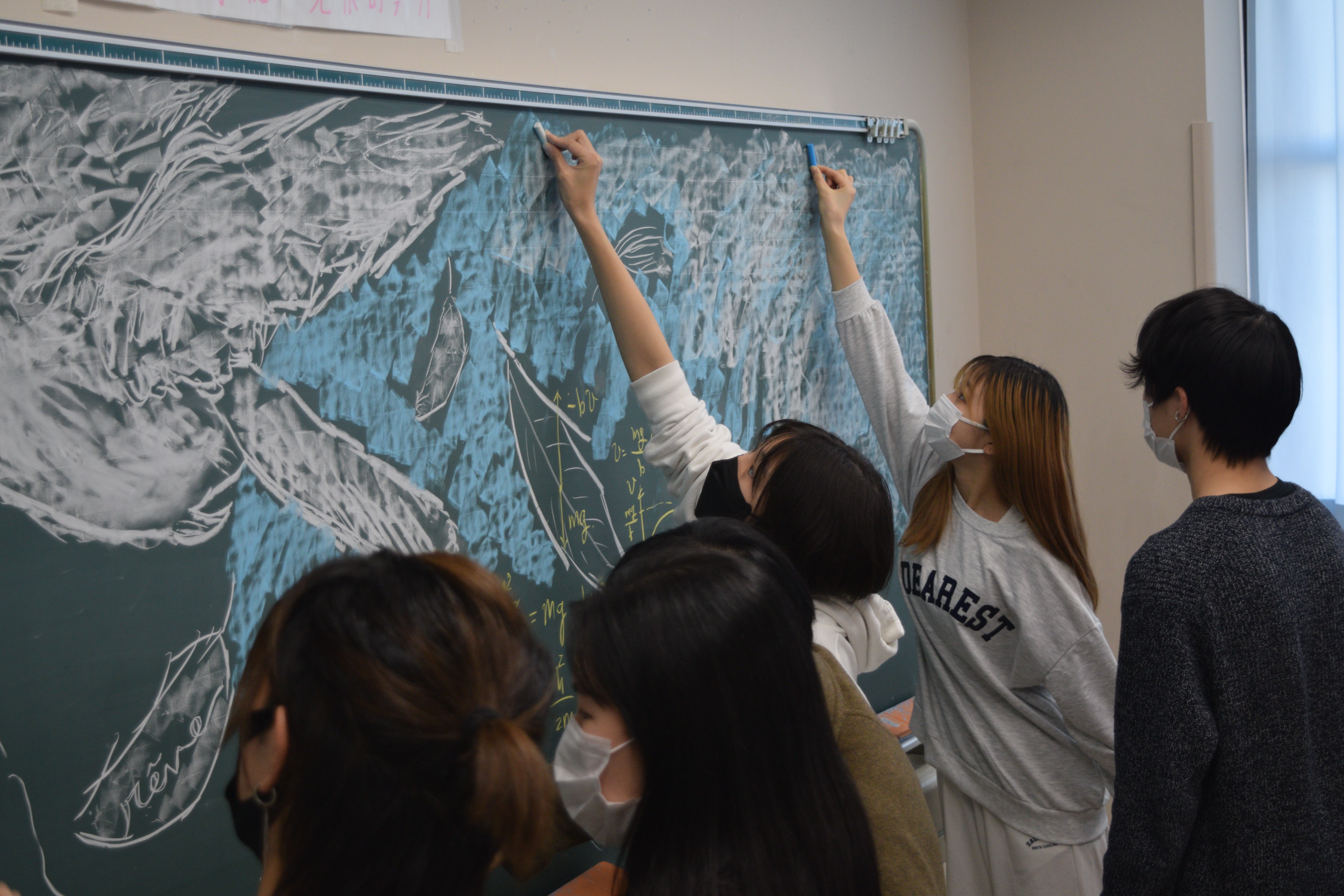 後半には、ディスカッションから生まれたイメージを基に、「KIS」をテーマに各グループで黒板アートを製作しました。